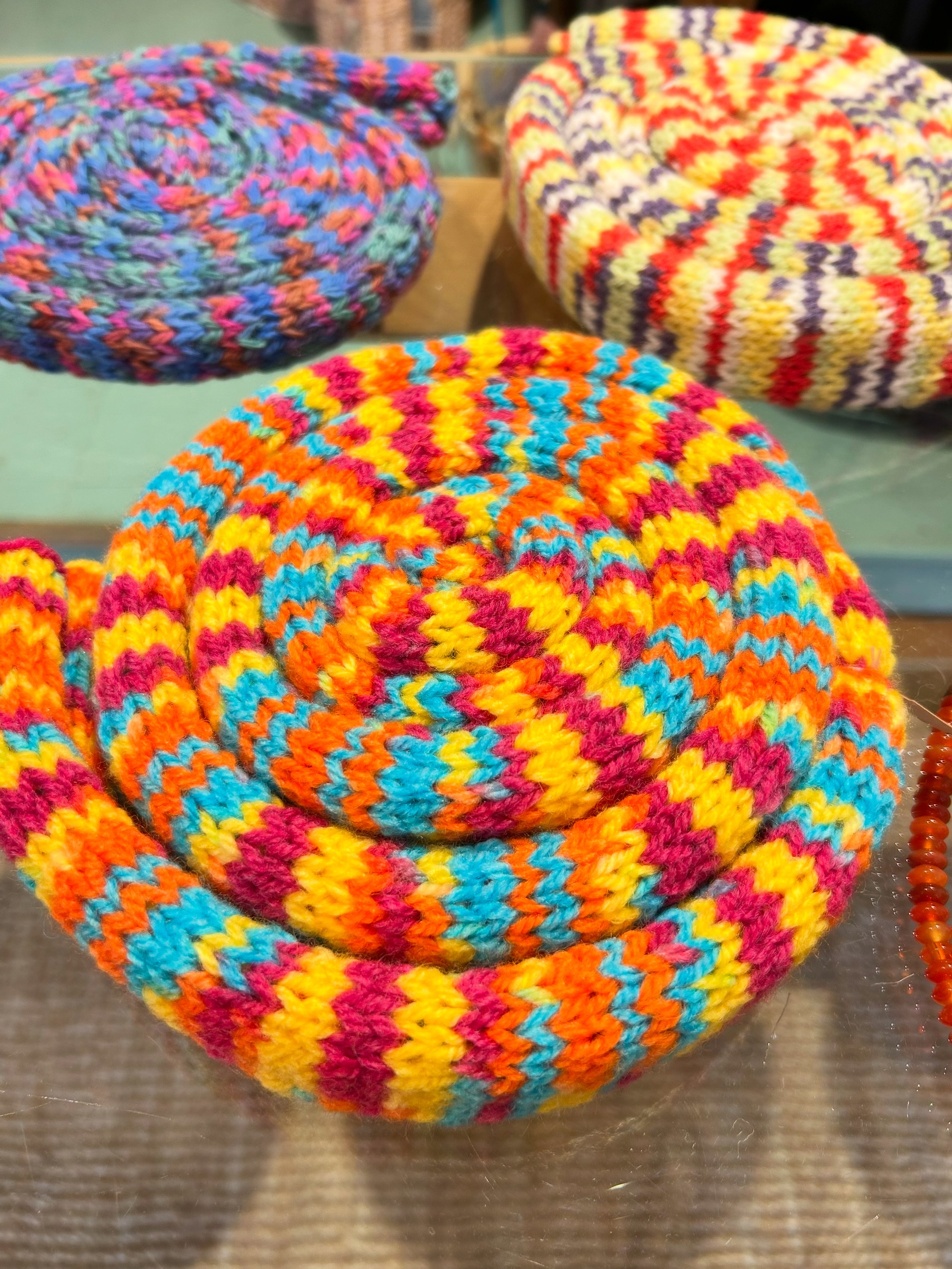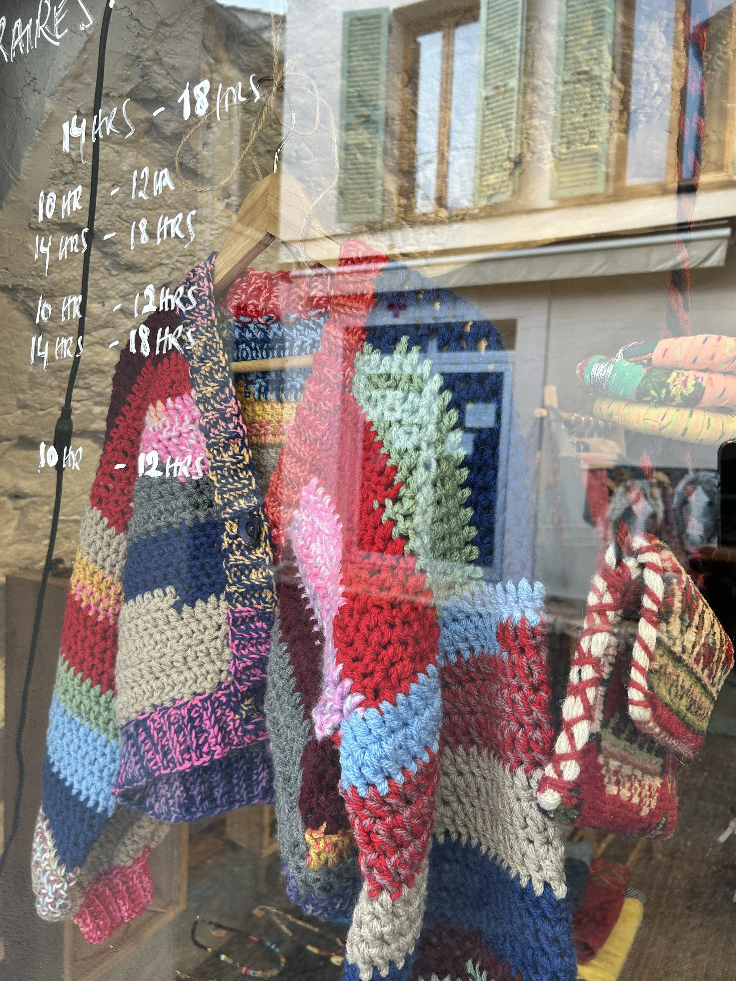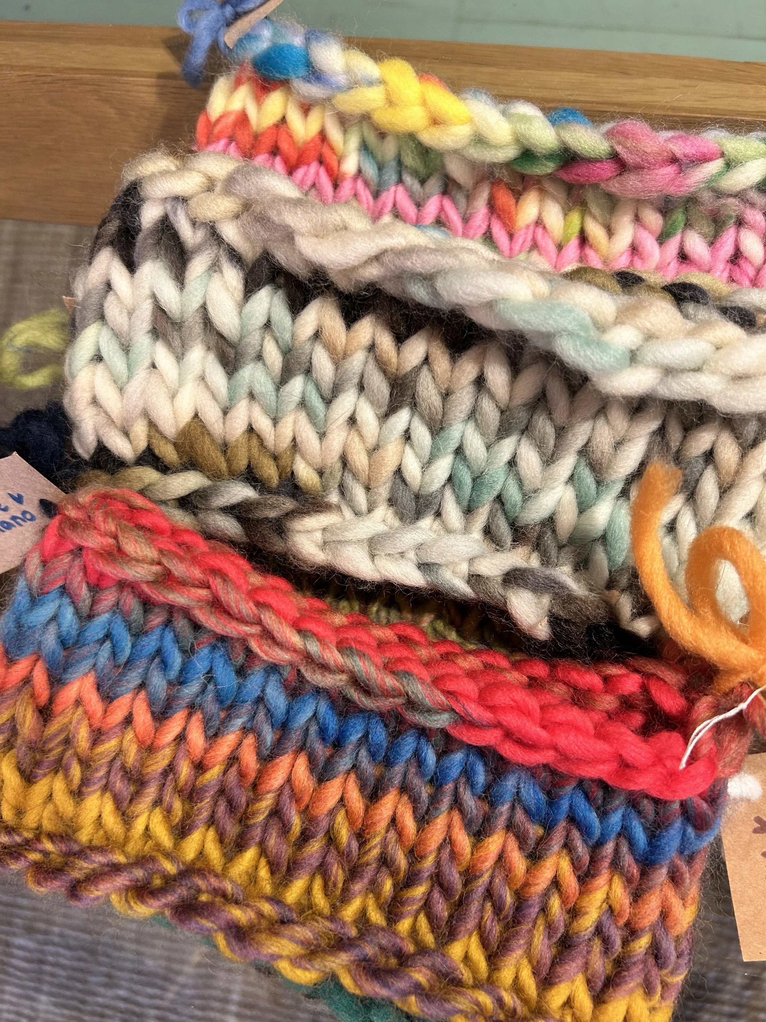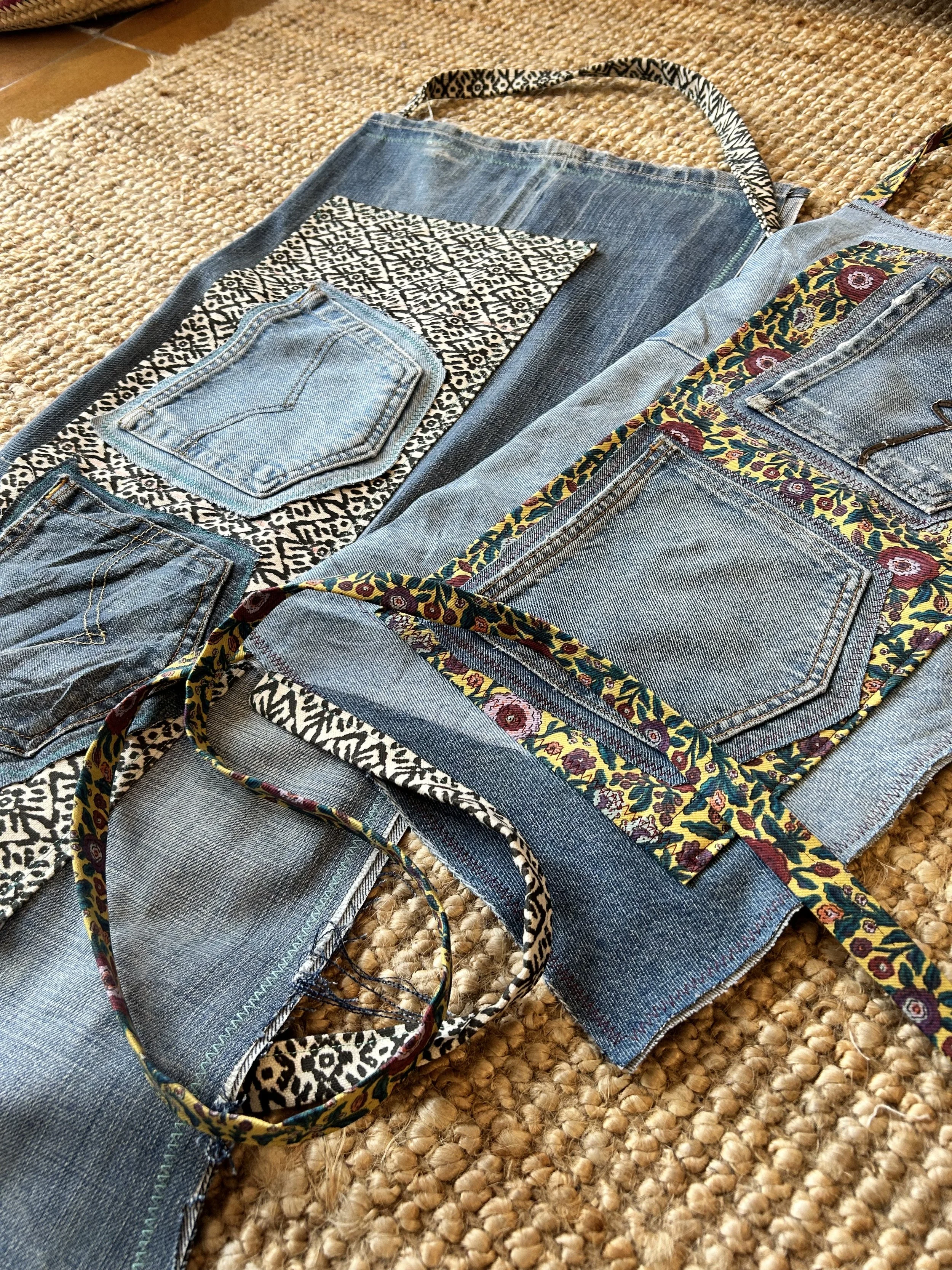 She uses a mixture of colours and textures with recycled fabrics to create her designs.